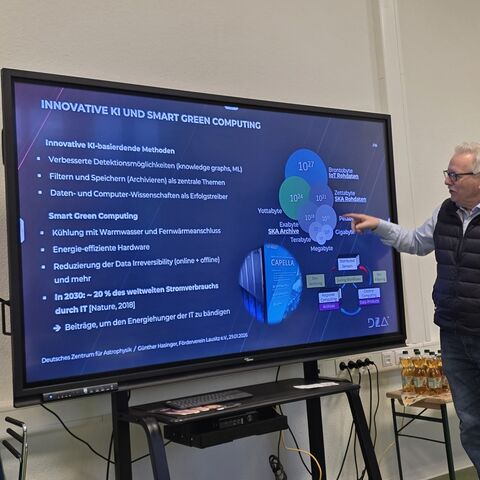 Die Präsentation über das DZA erfolgte durch Prof. Günther Hasinger. In beeindruckender Weise erläuterte er das Universum und stellte die Arbeit und die Mission des DZA vor. Insbesondere hob er die enge Kooperation mit vielen internationalen Partnern hervor. Darüber hinaus engagiert sich das DZA in der Lausitz - unter anderem in dem Bereich der MINT-Ausbildung. Im Anschluss an die herausragende Präsentation nahm sich Prof. Hasinger noch die Zeit, auf die zahlreichen Fragen der anwesenden Mitglieder einzugehen und bei der anschließenden Führung erhielten die Mitglieder einen Einblick in die praktische Arbeit des DZA.